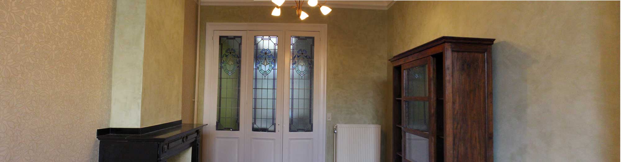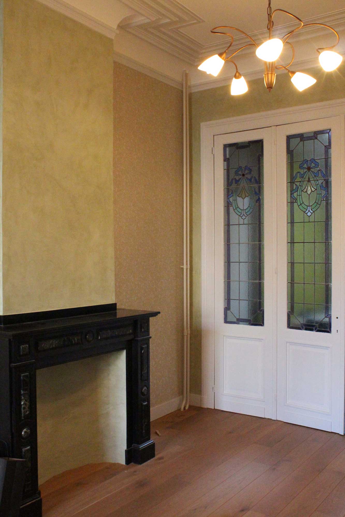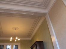 Voor de plafonds is er gekozen om de moulluren te accentueren met een lakverf in verschillende tonen.